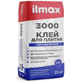 Плиточный клей ILMAX 3000 предусматривает укладку плитки размером не более 40 х 40 см. Клей может использоваться поверх следующих материалов: бетон, кирпич и блоки, всевозможные штукатурки, стяжки на основе цемента. Наиболее подходит для укладки плитки в кухнях, ванных, прихожих комнатах и других помещениях. Подходит для наружних работ.